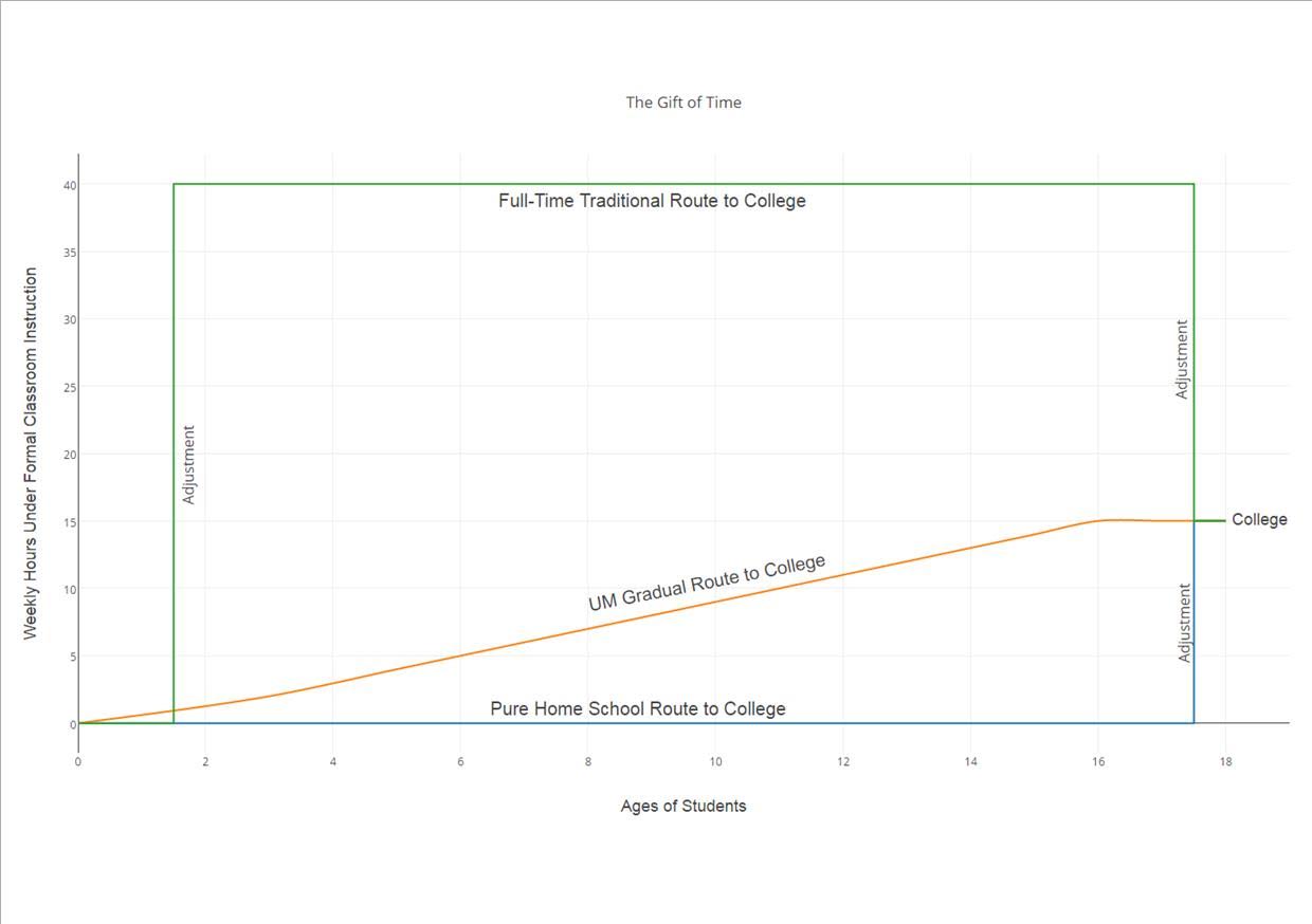 The upper portion of this diagram is the additional amount of time the University-Model®, in contrast to the traditional model, gives back to parents.